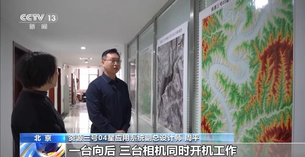 资源三号04星应用系统副总设计师 周平:卫星上面同时装载了三台相机拍摄,一台向前,一台垂直对地,一台向后,三台相机同时开机工作。一次成像能获取一个地面物体三个方向的影像,构成一个立体影像。类似于我们拍3D电影的时候,三个相机从不同的角度拍同一个场景之后,我们就可以播放出3D的电影效果。