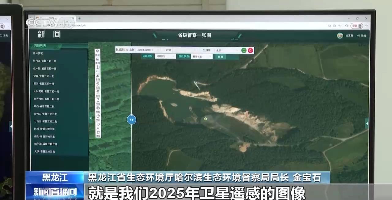 黑龙江省生态环境厅哈尔滨生态环境督察局局长 金宝石:这个图片就是我们2025年卫星遥感的图像,可以看到两个图片非常鲜明的变化,绿化率提高了。过去我们需要人员到现场进行实地的核查,一般每天一个工作人员只能核查3到5个点位,现在我们通过这项技术,每天每人平均能核查50个点位。