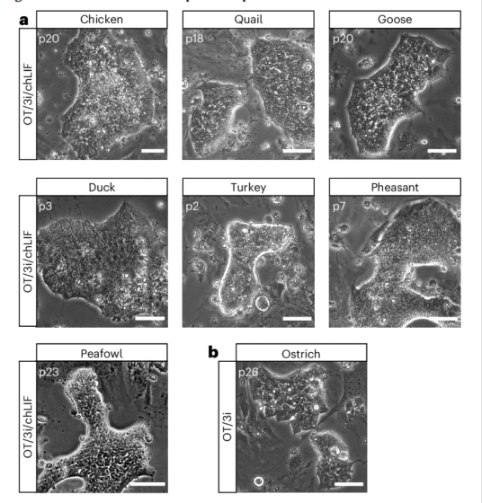 美国南加州大学干细胞研究中心团队利用蛋黄提取物作为培养基的核心成分,结合其他关键因子,从鸡以及另外7种禽类中分离出真正的胚胎干细胞,并长期维持其稳定特征。这些禽类胚胎干细胞在研究胚胎发育、培育实验室家禽,乃至拯救濒危甚至灭绝物种等方面展现出广阔的应用前景。该研究成果发表在近期《自然·生物技术》上。科学家从禽类中分离出真正的胚胎干细胞。图片来源:《自然·生物技术》真正的胚胎干细胞具备两大核心特性:一是自我更新能力,即能够持续增殖并保持未分化状态;二是多能性,即具备分化为胚胎所有细胞类型的潜能,无论是