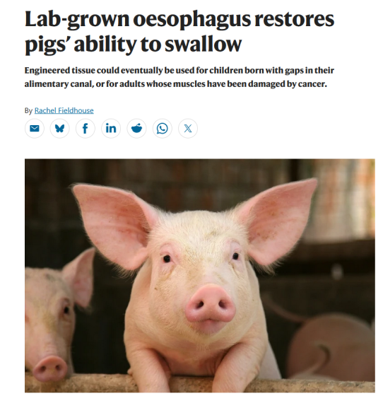 在再生医学领域,一项里程碑式的突破为无数先天性疾病患儿带来了新希望。英国科学家首次在实验室培养出功能完整的食管,并移植到猪体内,成功恢复了其正常吞咽功能。这项成果被视为器官替代工程领域的重要进步,为未来5年内启动人类临床试验奠定了坚实基础,有望彻底改变食管闭锁患儿的命运。相关论文发表于最新一期《自然·生物技术》。实验室培养食管成功恢复动物吞咽功能。图片来源:《自然》网站食管闭锁是一种严重的先天缺陷,患儿出生时食管与胃部未能连接。全球每年约有180名新生儿受此困扰。当前标准治疗方案是通过复杂手术进行重