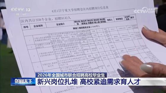 2026年全国城市联合招聘高校毕业生春季专场活动4月1日启动,各地重点面向2026届高校毕业生及往届未就业高校毕业生,组织综合性或行业性跨区域巡回招聘,推出海量岗位。人工智能、数字经济等新兴领域需求旺盛,校企同步发力,助力毕业生精准就业。来看记者4月1日从现场发回的报道。总台央视记者 唐蕾:我现在在宁夏银川的2026年全国春招启动仪式的现场,今天(4月1日)一共有1.1万多个岗位,从我手中的招聘岗位信息表可以看出,能源化工和新材料的岗位占了42%,人工智能、数字经济相关的前沿科技领域也备受求职者青睐。不仅是人工智能,记者